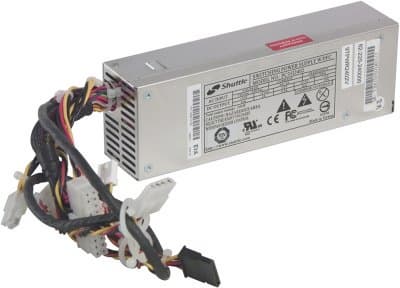 Silent X — серия БП Shuttle с повышенной мощностью и улучшенной системой охлаждения при очень невысоком уровне производимого шума. В данной модели применен БП мощностью 240 Вт, что далеко не рекорд, но мы в нашем тестировании ни с какими проблемами не столкнулись, хотя имитировали максимально возможную загрузку системы (3D-игры + копирование информации с DVD-привода). Silent X PC35I2402 имеет один разъем питания SATA, а вот 6-контактного разъема питания для PCIE-видеокарт он лишен, вместо этого предлагается подпитывать шину PCI Express через дополнительный разъем (как для флоппи-дисковода) на плате. БП имеет относительно большой, 80-миллиметровый вентилятор посередине внутренней боковой стороны — вариант, визуально представляющийся не самым удачным. Частота вращения этого вентилятора автоматически регулируется в зависимости от температуры внутри блока питания.