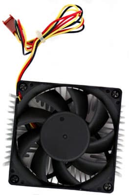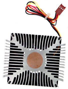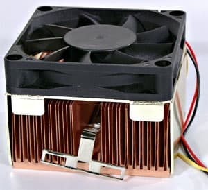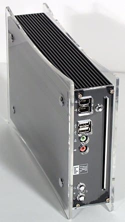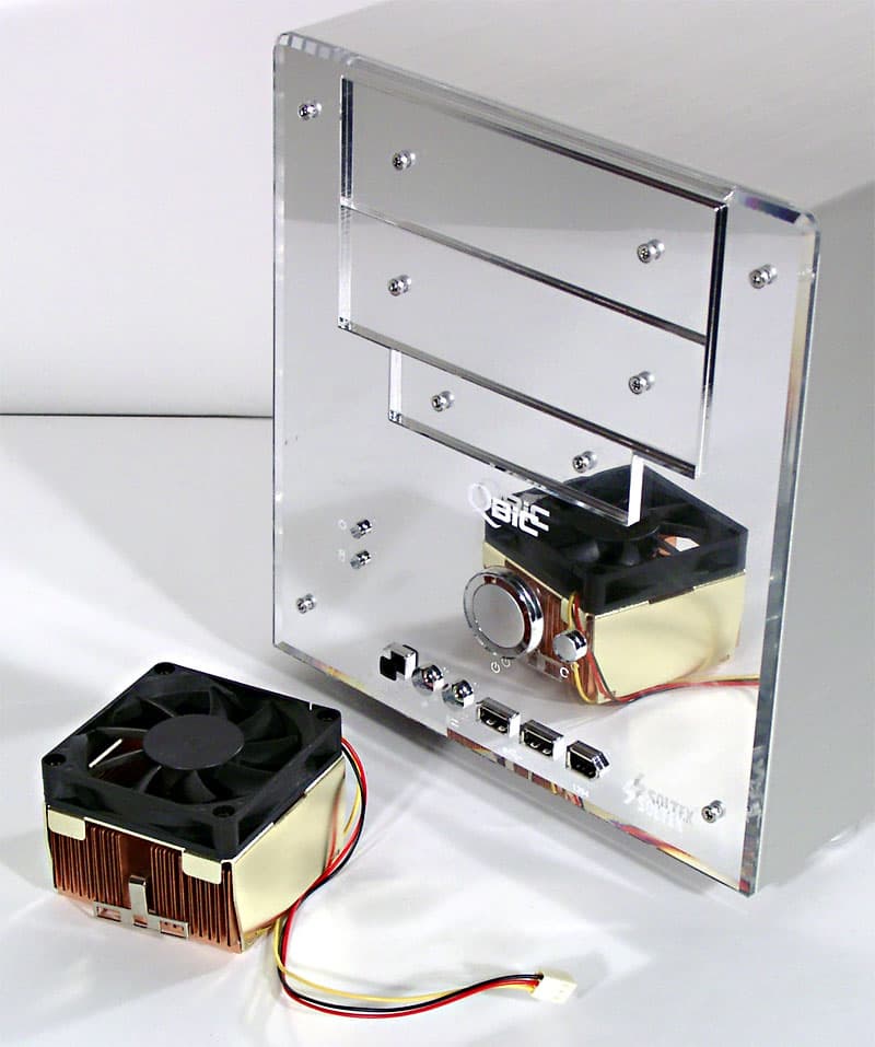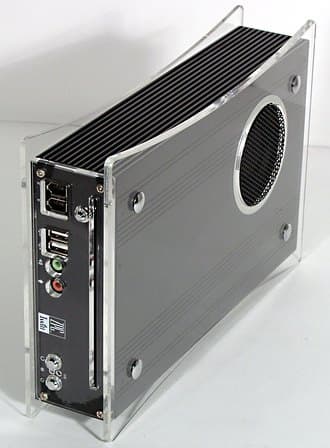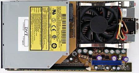 Ну, раз уж мы заговорили про температуры, обратим свой взгляд на единственное устройство охлаждения комплекта: это кулер производства неизвестной компании с 70-миллиметровым вентилятором от Bi-Sonic. Алюминиевый радиатор кулера высотой всего в 12 миллиметров выполнен в виде расходящихся «веточек» и обладает медным сердечником, а к плате он крепится при помощи двух клипс по бокам. Вентилятор нагнетает забираемый снаружи воздух на радиатор, и при этом частота его вращения составляет всего 28003000 об/мин, что (вкупе с бесшумными ноутбучными дисковыми накопителями) держит уровень шума системы на очень низком уровне. Пожалуй, можно утверждать, что это самый тихий barebone-комплект из протестированных нами на этот момент (и в принципе обладающих вентиляторами).