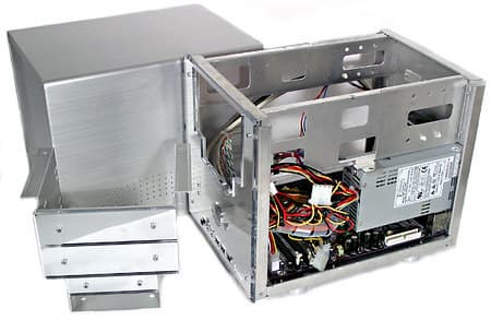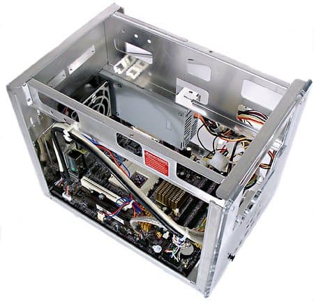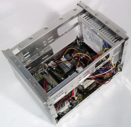Обстановка внутри, по вполне очевидным причинам, полностью соответствует таковой для корпуса любой barebone-системы Shuttle, а с EQ3000M она просто совпадает один в один. Мы не будем в очередной раз вдаваться в детали, но отметим, что сборку осуществлять очень удобно: в большинстве случаев вам вообще не придется ничего отвинчивать, и лишь дисковые накопители в корзину устанавливать желательно, сняв последнюю (это всего 2 винта).