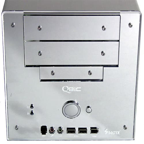 Свежевынутый из коробки корпус выглядит превосходно: серебристые кнопки (включения и перезагрузки системы) и черные крапинки портов хорошо гармонируют с зеркальной передней поверхностью. Впрочем, поскольку зеркальная накладка все-таки выполнена из пластика, через некоторое время на ней неизбежно появятся царапины, а уж следы от пальцев и иных жирных предметов вам придется стирать постоянно. Однако даже большей проблемой представляется потеря внешнего вида комплекта после установки внешних накопителей в 3- и 5-дюймовые отсеки. В общем, глядя на соблазнительные фотографии, держите в уме эффект от погружения EQ3701M в реальную жизнь. Также имейте в виду, что у этой модели серии Qbic пока нет «дублера» с матово-белой накладкой (и индексом «-W» в названии), но вполне вероятно, что в будущем все же можно будет выбрать наиболее устраивающий вас по внешним признакам вариант. Что же касается разъемов передней панели, то набор там, по нынешним меркам, невыдающийся, но все необходимое при этом под рукой, и все разъемы (кроме S/PDIF-Out) представлены также и на задней панели (что, опять же, предлагает вам выбор места для подключения, а это всегда хорошо). Итак, спереди у EQ3701M находятся оптический выход S/PDIF, два стандартных аудиоразъема, 2 порта USB (2.0) и один FireWire. Если вы вдруг не обратили до сих пор внимание, у описываемого barebone-комплекта 2 внешних отсека под 5-дюймовые накопители, что делает модели Soltek серии Qbic EQ3xxx уникальными среди всех виденных нами продуктов на рынке. При этом у EQ3000 и тут существует «дублер», с единственным отсеком под дисковод 5,25", а вот у рассматриваемой сегодня модели пока только один вариант поставки.