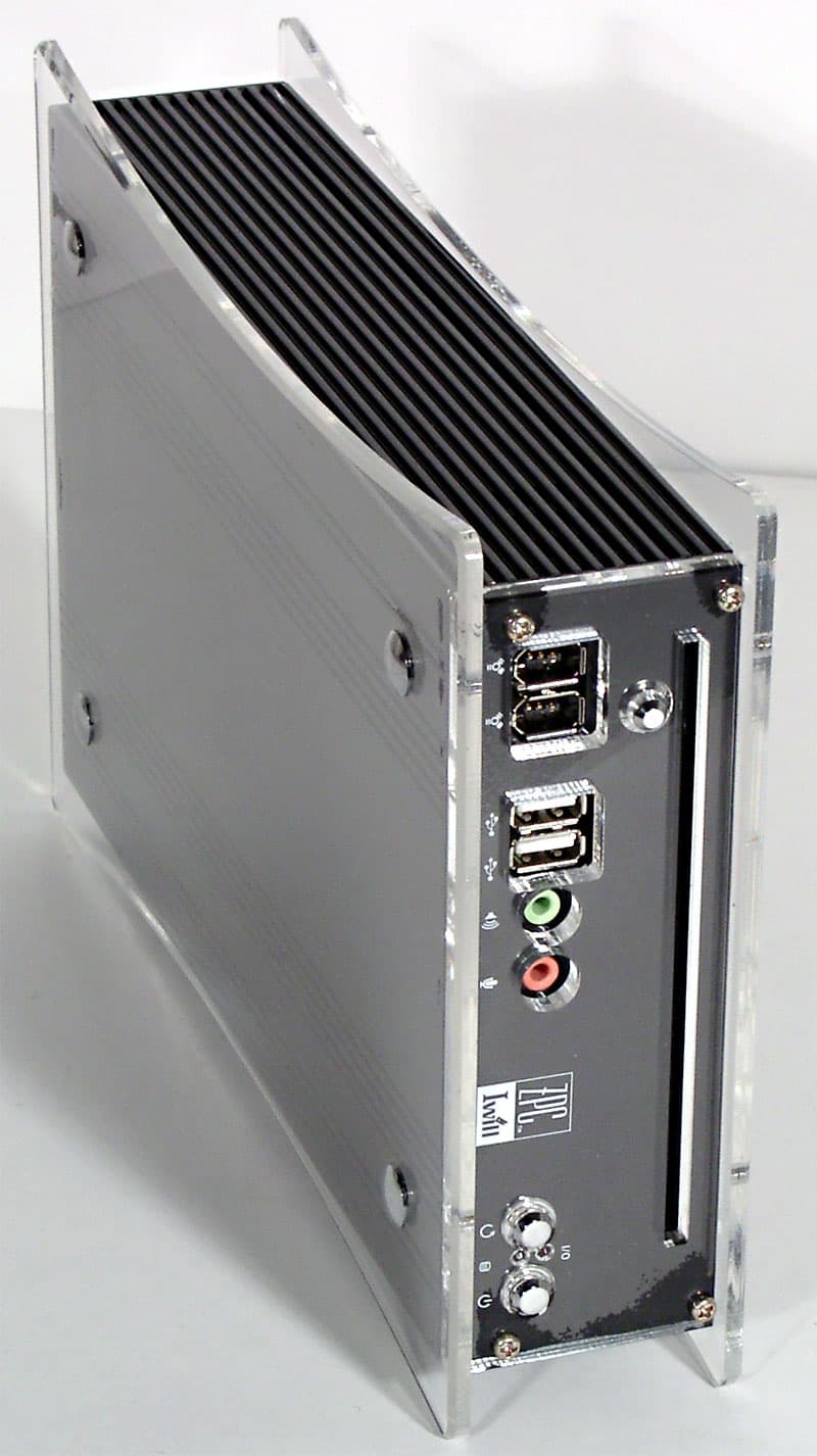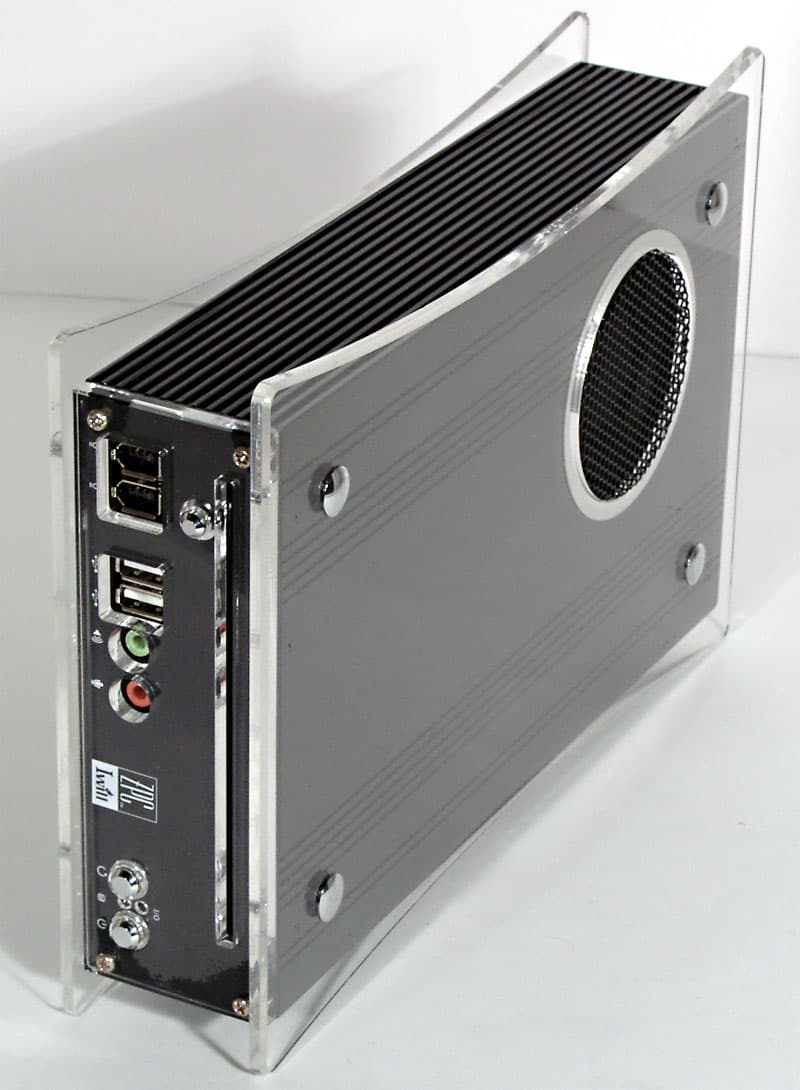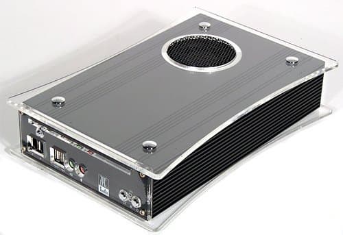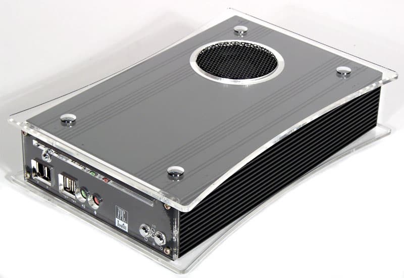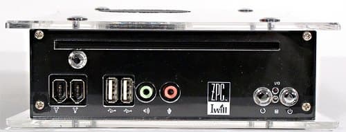 Итак, крохотный алюминиевый корпус, две фигурные плексигласовые пластины сверху и снизу, возможность установки вертикально. Последнее заявлено и даже рекомендуется в руководстве, но по фотографиям вполне можно оценить устойчивость Iwill ZPC в этом положении, так что для размещения на рабочем столе категорически не годится. Миниатюрные размеры принуждают прежде всего поинтересоваться вопросами охлаждения компьютера и тут нас ожидает первый сюрприз: отверстие для поступления внутрь воздуха лишь одно (на крышке, забрано декоративной решеткой), а помимо него есть только одно выходное на задней панели. Напрашивающиеся по бокам вентиляционные отверстия отсутствуют, возможно, во избежание воздействия горячего воздуха на установочную поверхность (при размещении ZPC в вертикальном положении в какой-нибудь мебельной полочке/тумбочке). Разумеется, подстать габаритам и вес этой модели не более 4 кг в максимальной экипировке.
