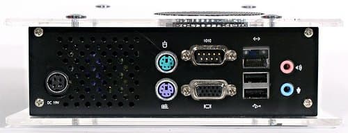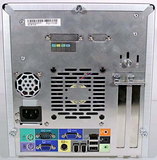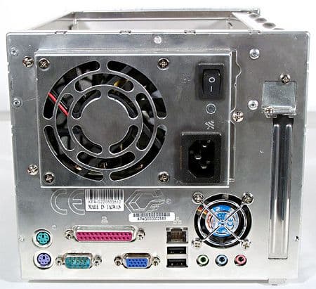 А вот задняя панель и вовсе не претерпела никаких изменений, там в прежнем порядке готовы «оживить» периферию 2 порта PS/2, 1 LPT, 1 COM, 1 VGA, 1 LAN, 2 USB (2.0) и 3 Audio. Поменялись относительно обычной ситуации вентиляторы: большой выдувает воздух из БП (интересного, кстати, почти не встречающимся у миниатюрных компьютеров выключателем питания), а маленький пытается охлаждать внутренности корпуса напрямую. Завершает картину выход для единственной карты расширения.