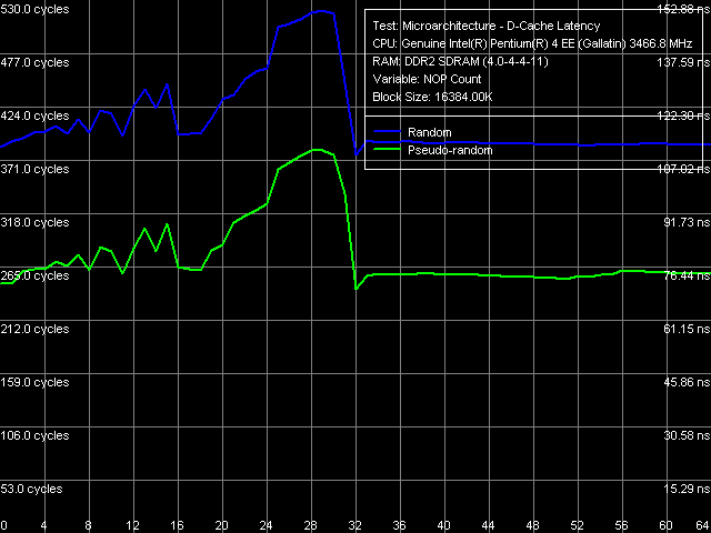 Методика измерения латентности, применительно к процессорам семейства Pentium 4, была подробно разработана, обоснована и описана ранее. Поэтому остановимся на ней лишь вкратце: в тесте латентности используется псевдослучайный (а также полностью случайный) режим обхода сравнительно большого блока памяти (16 МБ) с шагом в 128 байт («эффективный» размер строки кэша L2/L3, связанный с аппаратной предвыборкой смежной строки из памяти в кэш во всех режимах обхода).