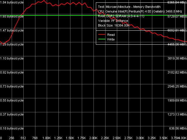 Переходя к максимальным величинам (соответствующие кривые представлены на графике), отметим, что на деле и они не являются особо «максимальными», ибо они также реально ограничены архитектурой процессора (ПСП на чтение эффективностью алгоритма Software Prefetch, на запись эффективностью прямого доступа в память, минуя кэш процессора). Максимальная реальная ПСП на чтение на первой платформе 5388 МБ/с (84.2 % от теоретического максимума 6.4 ГБ/с). 266-МГц шина дает увеличивает значение этого параметра до 6366 МБ/с, что на 18.2 % выше по абсолютной величине, но вновь ниже в относительных единицах (74.6% от теоретического максимума 8.53 ГБ/с).