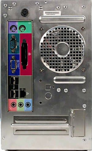 На алюминиевой крышке корпуса нет решительно ничего интересного, даже вентиляционных отверстий (они расположены на дне, так что не вздумайте снимать ножки), а на задней панели представлен вполне обычный и в какой-то степени даже устаревший набор разъемов. FireWire отсутствует, «видео-» (TV-Out, DVI) и «аудионавороты» (S/PDIF) тоже, зато в наличии 2 PS/2, 1 LPT, 1 COM, 1 VGA, 1 LAN, 4 USB (2.0) и 3 Audio. Ну а компенсировать нехватку встроенных мультимедийных возможностей вам помогут две карты расширения, под выход которых на задней панели есть место.
