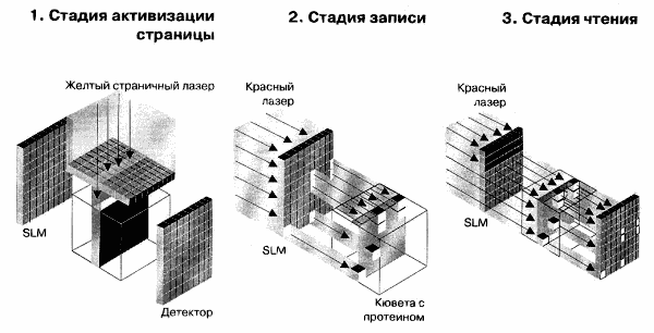 При записи данных сначала надо зажечь желтый "страничный" лазер — для перевода молекул в Q-состояние. Пространственный световой модулятор (SLM), который, как говорилось ранее, представляет собой LCD-матрицу, создающую маску на пути луча, вызывает возникновение активной (возбужденной) плоскости в материале внутри кюветы. Эта энергоактивная плоскость представляет собой страницу данных, которая может вмешать массив 4096x4096 bit. Перед возвратом протеина в состояние покоя (в нем он может находиться довольно длительное время, сохраняя информацию) зажигается красный, записывающий лазер, располагаемый под прямым углом по отношению к желтому. Другой SLM отображает двоичные данные и, таким образом, создает на пути луча соответствующую маску, поэтому облучению подвергнутся только определенные пятна (точки) страницы. Молекулы в этих местах перейдут в Q-состояние и будут представлять двоичную единицу. Оставшаяся часть страницы возвратится в первоначальное bR-состояние и будет представлять двоичные нули. Для того, чтобы прочитать данные, надо опять зажечь страничный лазер, который переводит читаемую страницу в Q-состояние. Это делается для того, чтобы в дальнейшем, с помощью различия в спектрах поглощения, идентифицировать двоичные нули и единицы. Через 2ms после этого страница "окунается" в низкоинтенсивный световой поток красного лазера. Низкая интенсивность нужна для того, чтобы предупредить "перепрыгивание" молекул в Q-состояние. Молекулы, представляющие двоичный нуль, поглощают красный свет, а представляющие двоичную единицу пропускают луч мимо себя. Это создает "шахматный" рисунок из светлых и темных пятен на LCD-матрице, которая захватывает страницу цифровой информации.