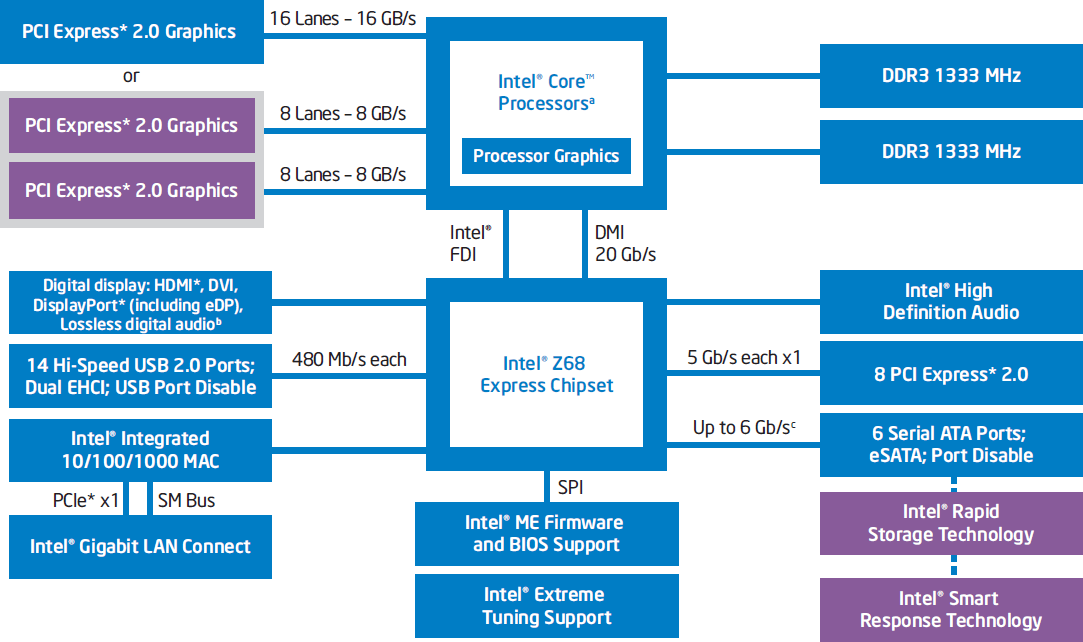 Как мы уже упомянули, Z68 объединил достоинства чипсетов серии 6x, поддерживая одновременно встроенную графику новых процессоров (вывод картинки, формируемой видеоядром и пересылаемой по специальному интерфейсу FDI, на дисплей через набор видеовыходов на любой вкус: HDMI 1.4, Display Port, DVI, аналоговый d-Sub; два независимых потока), работу двух видеокарт в режиме x8+x8, а также не помеченные (явно) на блок-схеме возможности для разгона процессоров (включая вариант с разгоном видеоядра).