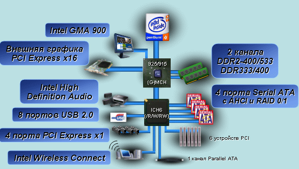 4 порта PCI Express x1. Конечно же, отнюдь не случайно полное название новых чипсетов выглядит как Intel 9xxx Express. Приход PCIE на место PCI — это событие, которое по своей важности перекрывает даже начало перехода на DDR2, не то что какую-то смену сокета: PCI Express, во всяком случае, на рынке просуществует куда дольше. Одноканальный вариант PCI Express предназначен для работы с обычной настольной периферией, так что несколько слотов PCIEx1 (пропускная способность 500 МБ/с) и, возможно, распаянных контроллеров, подключенных к южному мосту именно по этому интерфейсу, мы будем видеть на новых материнских платах постоянно. За теорией отсылаем вас к нашему представлению PCI Express, с практикой же всем придется столкнуться совсем скоро, ибо индустрия уже начала переход на эту шину.