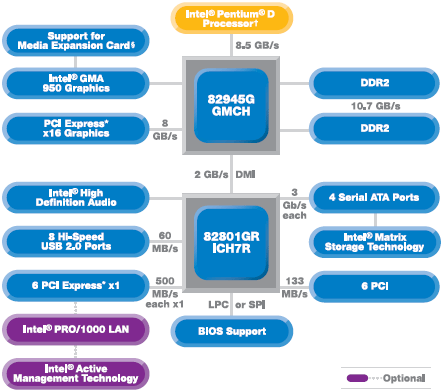 * UPDATE: вскоре после выхода процессоров на ядре Core 2, информация на сайте производителя (Intel) была обновлена, и чипсеты i945P/G задним числом получили официальную поддержку процессоров Core 2 Duo (что де-факто означает также поддержку Core 2 Extreme/Quad и Celeron на ядре Core 2).
