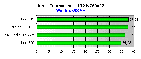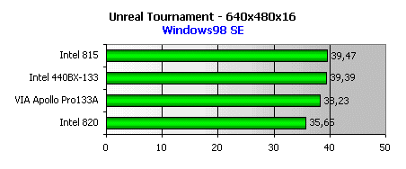 А вот в Unreal Tournament, сильно нагружающем всю систему в целом, включая и процессорную шину, на высоте снова i815.