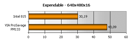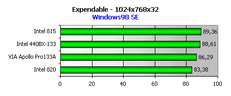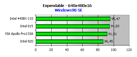 Чтобы оценить, насколько эффективно чипсет функционирует с памятью, достаточно запустить Expendable. И снова мы видим неопровержимое доказательство того, что Intel не ударил в грязь лицом, выпустив i815. Не стоит удивляться и низким результатам i820: Expendable не требует потоковой передачи данных, потому RDRAM оказывается бессильна.
