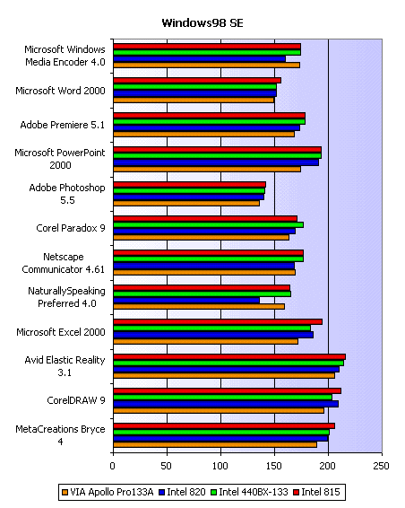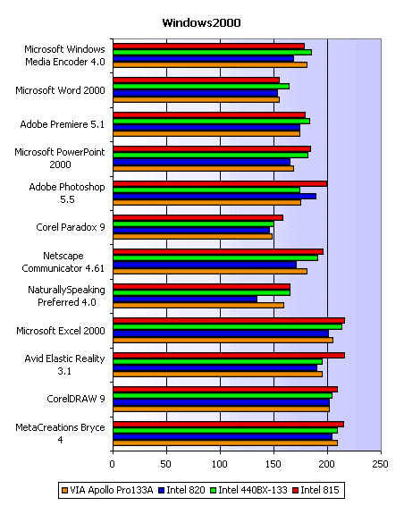 Как ни странно, смена операционной системы привела к краху i820. Наш же герой, i815, на высоте и в Windows 2000. Вот раскладка результатов SYSmark 2000 по конкретным приложениям: