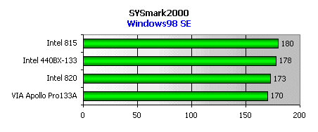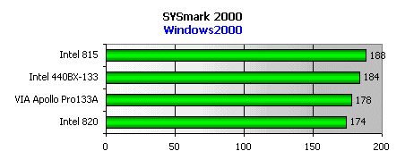 Здесь расклад несколько другой, так как в этом тесте используется более широкий спектр типовых офисных приложений. Но лидирует опять i815, подтверждая тот факт что контроллер памяти в этом чипсете один из самых лучших. Даже никогда ранее непревзойденный i440BX отстал от нашего новичка на пару пунктов.
