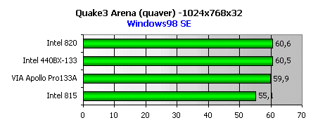 Стандартный тест в низком разрешении в Quake3 обнаруживает превосходство разогнанного i440BX, функционирующего при частоте FSB 133 МГц.