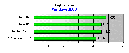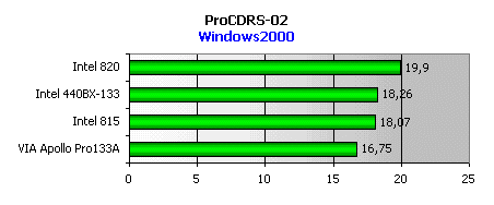 По результатам данного теста, измеряющего средневзвешенную производительность в типичных приложениях создания контента, лидером выходит i815. На втором месте — i820, производительность которого находится на таком высоком уровне благодаря применению системной памяти типа RDRAM, имеющей большую пропускную способность.
