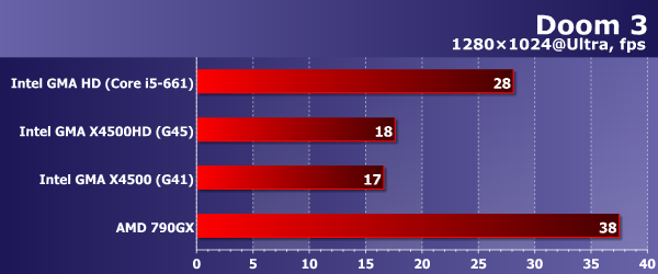 Doom 3, правда, к современным играм не отнесешь даже с натяжкой, но это стандартный репер тестирований такого плана. Кроме того, это заодно привет из прошлого и от Windows XP (остальные тесты выполнялись под Windows Vista), а также, по совместительству, единственная игра в нашем обзоре, которая позволила получить приемлемый показатель fps в разрешении 1280×1024 при максимальном предусмотренном разработчиками качестве графики. Цифры производительности получились вполне наглядными для демонстрации относительной разницы между сравниваемыми интегрированными видеоускорителями, и, забегая вперед, разницу они зафиксировали абсолютно типичную для сегодняшней подборки.
