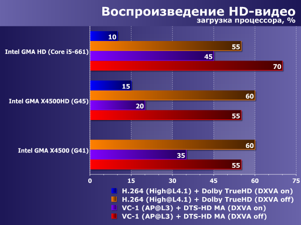 Понятно, что напрямую сравнивать результаты разгрузки процессора видеоускорителями GMA HD и GMA X4500/HD нельзя — у них попросту разные процессоры. Тем более ничего кроме путаницы не добавили бы показатели системы на платформе AMD (с трехъядерным процессором), так что она на этой диаграмме вообще не представлена (отсылаем желающих убедиться, что DXVA-ускорение на чипсетах AMD работает, к обзору чипсетов 780G/740G).