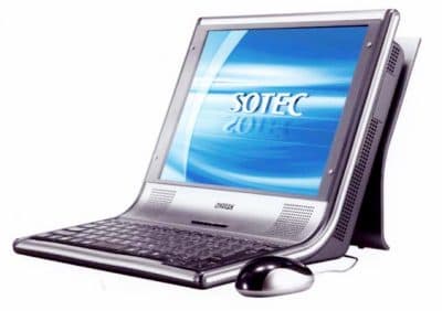 В целом же, выдвигаемые разными компаниями современные концепты и серийные ПК причудливых форм очень часто содержат в своем оформлении некие элементы портативных ПК. Ничего удивительного в этом нет: эргономика и дизайн ноутбуков разрабатываются уже не первое десятилетие, грех было бы игнорировать такой опыт. Кстати, симптоматично, что выпуском настольных ПК с оригинальным дизайном зачастую занимаются компании, ранее замеченные как раз в качестве производителей ноутбуков. Подтверждением тому опыт тайваньской Sotec, выпустившей в 2003 году целую серию необычных настольных новинок. Одна из таких разработок компании настольный ПК Afina AS, где ЖК-дисплей объединен с корпусом, там же размещается оптический привод и прочие компоненты. При весе в 4,1 кг базовая модель серии Afina AS оснащена 12,1-дюймовым XGA ЖК-дисплеем, процессором серии Mobile Athlon XP DVD/CD-RW приводом и встроенным ТВ тюнером.