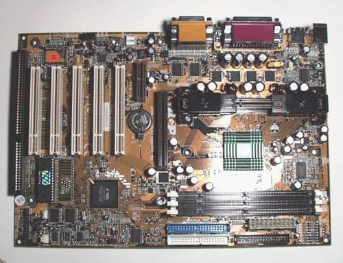 - ASUS K7V. ASUS реализовал в своей материнке много возможностей, которые могут понравиться той категории пользователей, которая привыкла выжимать из своего PC все, на что он только способен. Функции управлением напряжением питания процессором, большой диапазон устанавливаемых частот FSB и продвинутый аппаратный мониторинг не могут оставить равнодушными оверклокеров. Нельзя обойти вниманием и тот факт, что производительность, показанная этой платой — одна из лучших. Однако, данная плата имеет некоторые недостатки в дизайне: чрезмерно большой размер и отсутствие слотов ISA.