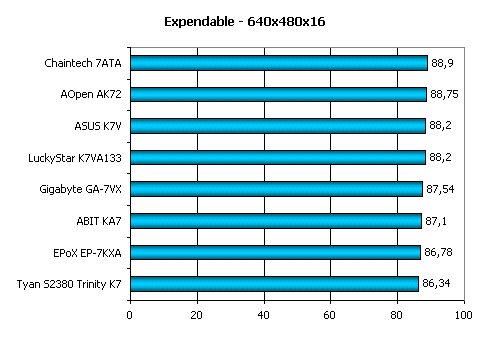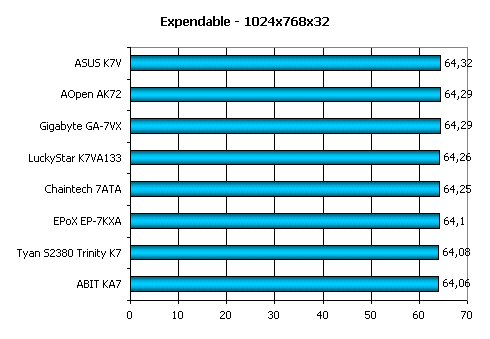 Expendable, помимо AGP нагружает и шину памяти, потому результаты показанные испытываемыми платами здесь отдаленно напоминают показатели в офисных приложениях. Поэтому в группе лидеров снова ASUS K7V.