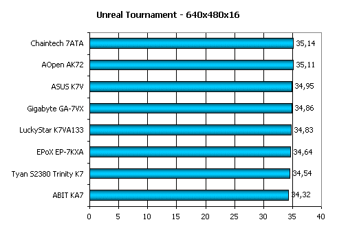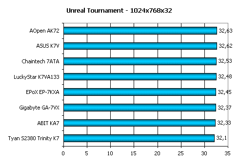 Unreal Tournament относится к играм, нагружающим в первую очередь центральный процессор системы и процессорную шину. В этих условиях на высоте себя показывают две платы — ASUS K7V и AOpen AK72.