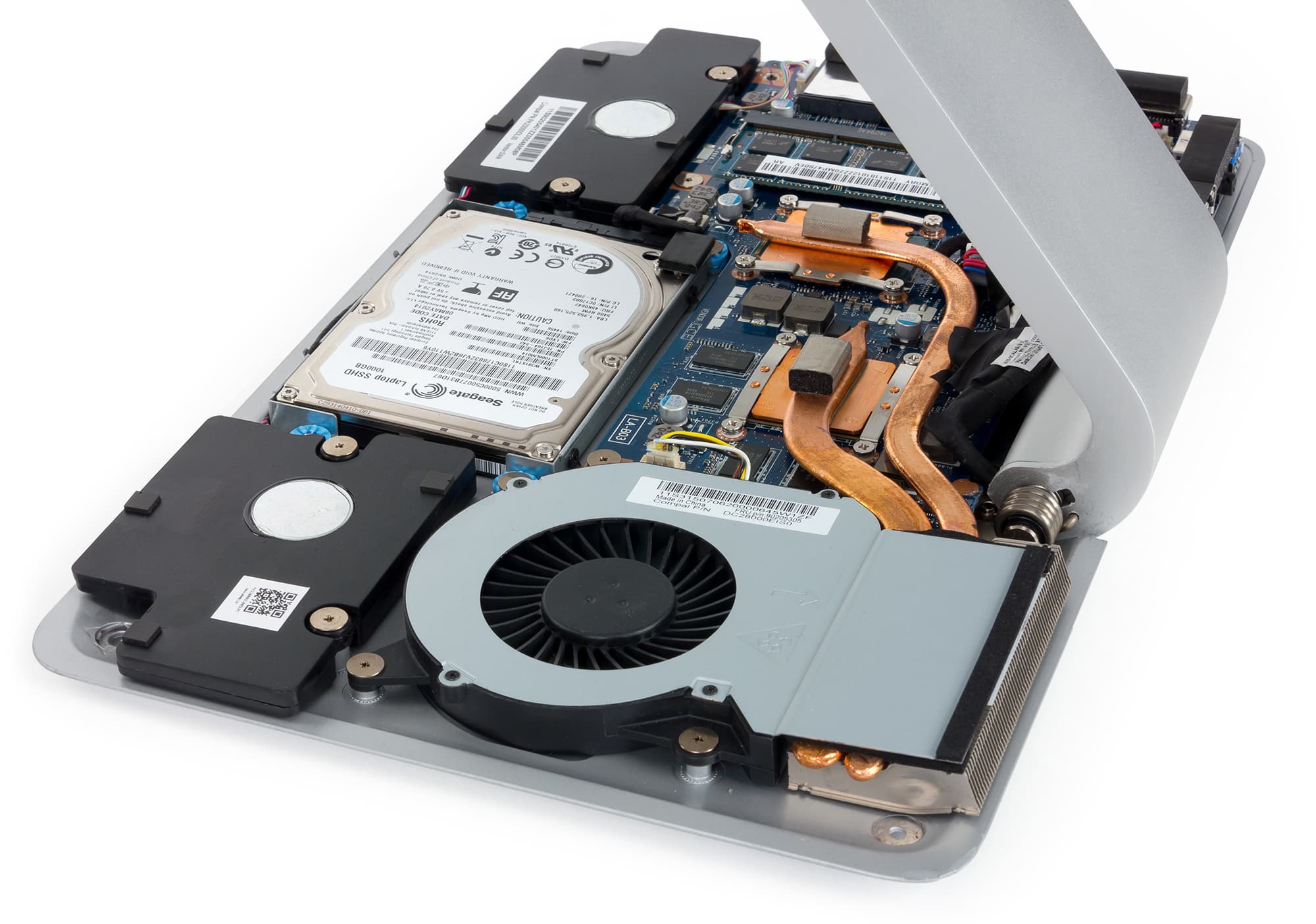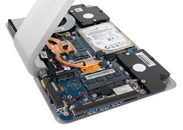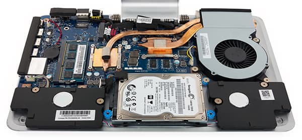 Сняв верхнюю металлическую панель корпуса подставки, можно получить доступ ко всем компонентам моноблока. Это и SSHD-накопитель, и модуль памяти, и система охлаждения процессора и видеокарты.