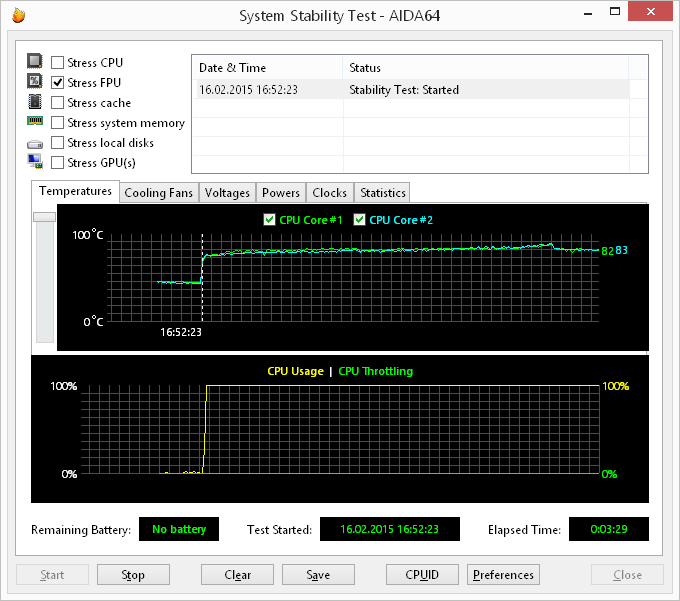 При загрузке процессора тестом Stress FPU, который использует вычисления c плавающей точкой и в большей степени нагревает процессор, максимальная установившаяся частота процессора составляет 2,8 ГГц, а температура ядер процессора составляет уже 83 °С.