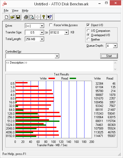 Утилита ATTO Disk Benchmark определяет максимальную скорость последовательного чтения на уровне 80 МБ/с, а записи — на уровне 110 МБ/с. Вообще, по данным утилиты ATTO Disk Benchmark, если скорость записи для этого накопителя еще можно считать нормальной, то вот со скоростью чтения наблюдаются большие проблемы.