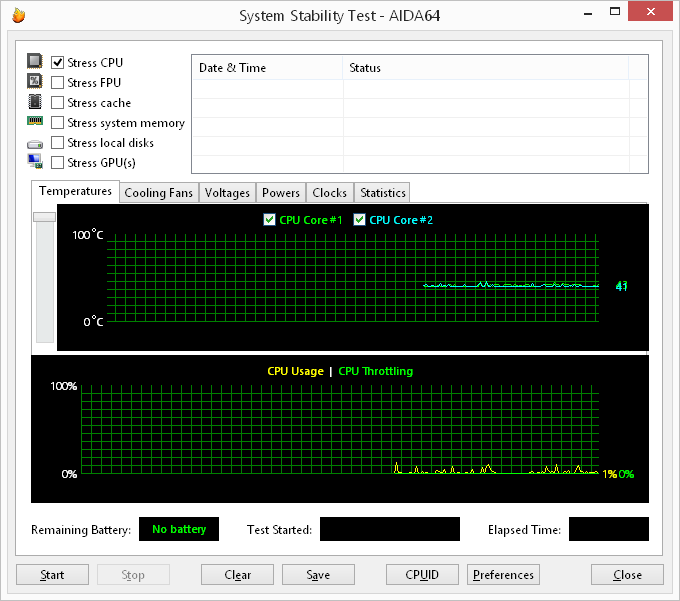 При загрузке процессора тестом Stress CPU (утилита AIDA64 Extreme Edition, тест на стабильность системы), который использует целочисленные вычисления, частота процессора составляет 3,2 ГГц (напомним, что для процессора Intel Core i7-4558U максимальная частота в режиме Intel Turbo Boost составляет 3,3 ГГц). Температура процессора в этом режиме загрузки составляет 64 °С.