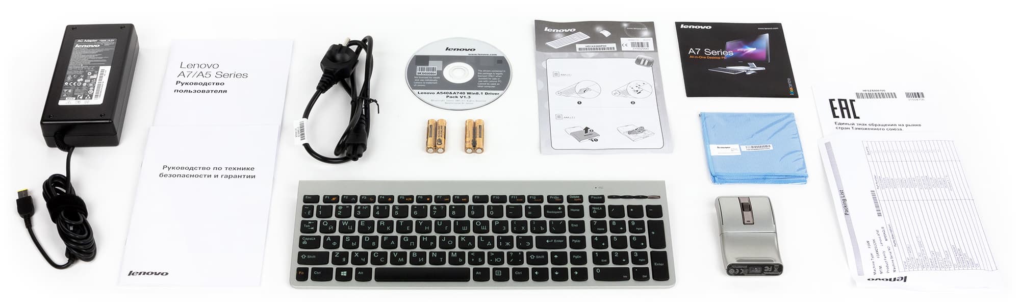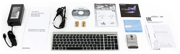 Кроме самого моноблока, в комплект поставки входит адаптер питания мощностью 150 Вт (19,5 В, 7,7 А), беспроводная клавиатура и беспроводная мышка.