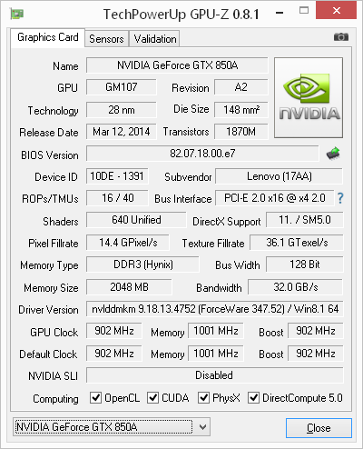 Помимо интегрированного в процессор графического ядра, моноблок Lenovo A740 снабжен и дискретной видеокартой Nvidia GeForce GTX 850A. Опять-таки, некоторые модели A740 могут комплектоваться дискретной видеокартой Nvidia GeForce GT 840A. Видеокарта в любом случае распаяна на системной плате и не подлежит замене.