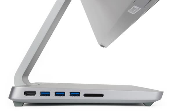 На левом торце корпуса подставки расположены три порта USB 3.0, слот для карт памяти и разъем HDMI.