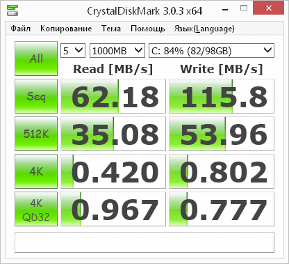 Утилита CrystalDiskMark определяет скорость последовательного чтения на уровне 62 МБ/с, а записи — на уровне 116 МБ/с.