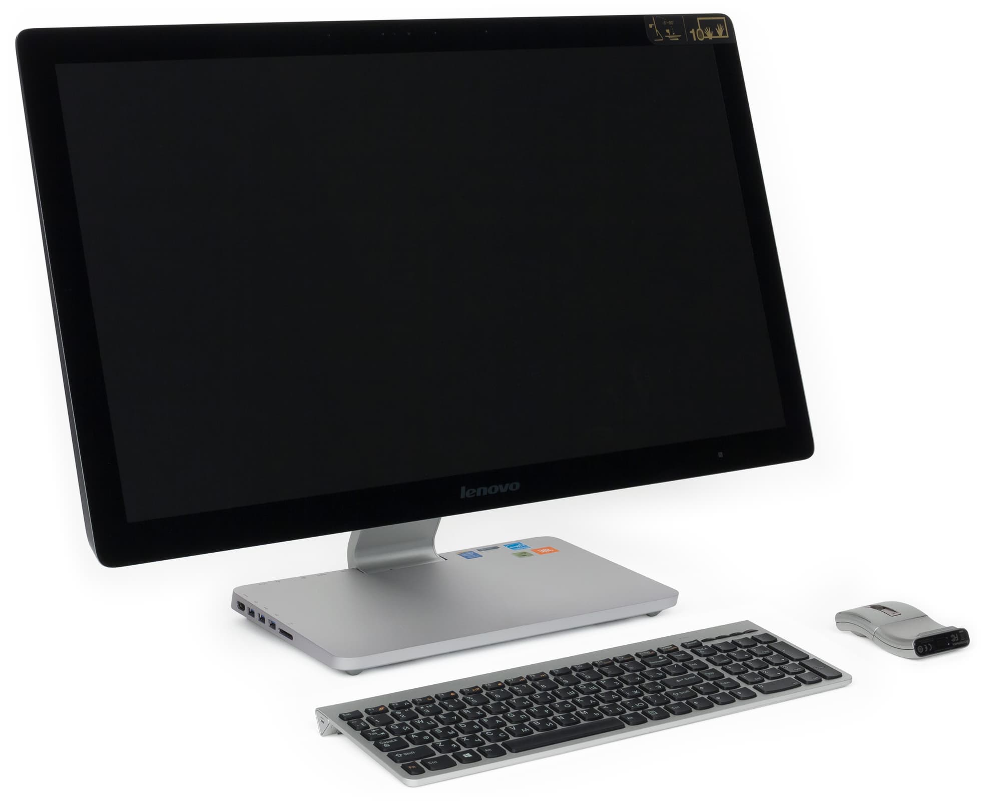 Экран в моноблоке Lenovo A740 сенсорный, и в данном случае это оправдано и является неоспоримым преимуществом устройства. Причем экран воспринимает 10-точечный сенсорный ввод (хотя вряд ли этим хоть кто-то пользуется). Экран имеет так называемую безрамочную конструкцию, то есть дисплей вместе с рамкой закрыты стеклом, образующим единую фронтальную плоскость.