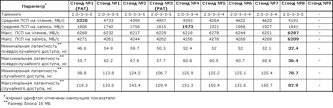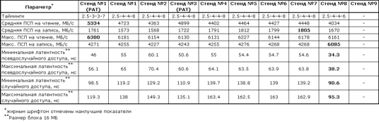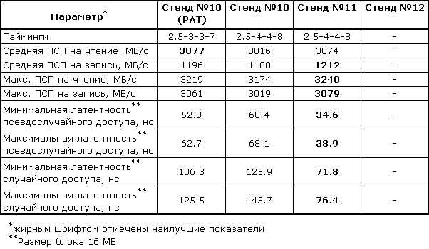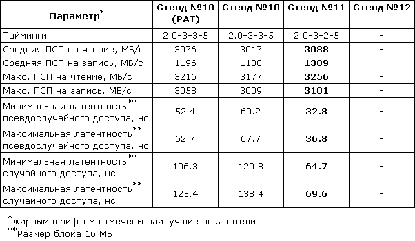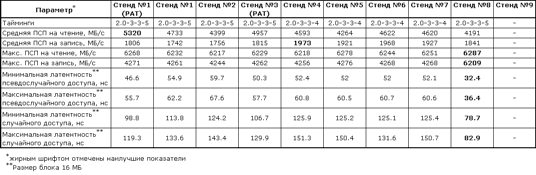 Вторая серия тестов проводилась с минимально возможными значениями таймингов, не приводящими к сбоям в работе подсистемы памяти.