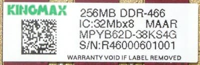 Описание (data sheet) модулей Kingmax DDR-466 не содержит информации о расшифровке отдельных составляющих Part Number модулей. В документации приводятся лишь краткие технические характеристики, соответствующие тому или иному Part Number. Характеристики рассматриваемого модуля приведены ниже.
