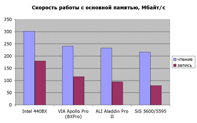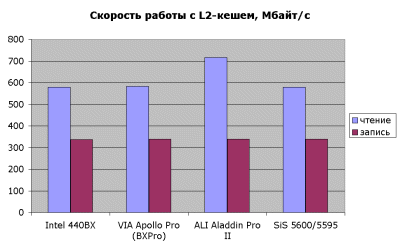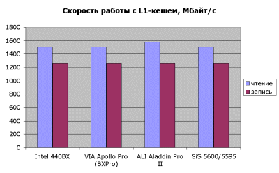 Первым делом была протестирована скорость работы с кешами различных уровней и основной памятью у различных чипсетов. Это испытание проводилось c процессором Intel Pentium 400 МГц. Результаты получены следующие: