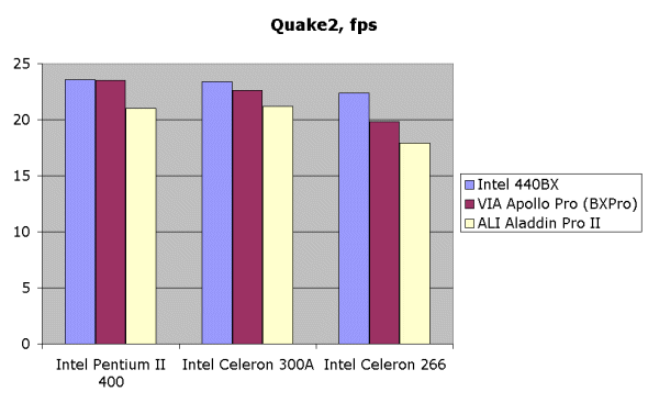 О чем говорит полученный результат? Так как ALI Aladdin Pro II с памятью работает быстро, но тем не менее показывает низкие результаты в Quake2 даже с процессором Pentium II, это можно объяснить только лишь плохой (непроизводительной) реализацией контроллера AGP в этом чипсете. Относительно высокий результат чипсета VIA Apollo Pro говорит как раз об обратном — несмотря на не очень быстрый контроллер DRAM, что проявляется в снижении производительности с безкешовыми процессорами, скорость порта AGP достаточно неплохая. Кстати, общее отставание неинтеловских микросхем с процессорами Celeron от i440BX обуславливается как раз тем, что скорость работы последнего с памятью выше, чем у остальных чипсетов. А процессор Pentium II, имея кеш большого объема "сглаживает" этот недостаток.
