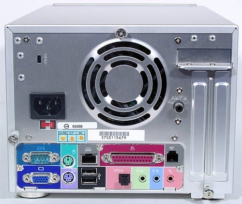 Планировка задней панели в целом привычна, но две вещи обращают на себя особое внимание: разъем для подключения радиоантенны и телефонная розетка (RJ-11). Если антенна нас уже не удивляет, мы видели ее в деле, то интегрированный модем это очень приятный сюрприз, так как обычно производители игнорируют потребности рядовых пользователей нашей страны непобедивших кабельных сетей. Разумеется, всегда остается вариант с внешним модемом (слота PCI, даже если он есть у barebone-комплекта, под «классический» внутренний модем обычно жалко), но ведь не зря же придумывали умные люди все эти AC'97 и MC'97, интерфейсы которых давным-давно уже интегрированы в южные мосты всех чипсетов? Общий набор портов на задней панели выглядит так: 1 COM, 1 VGA, 2 PS/2, 1 RJ-45 (LAN), 2 USB (2.0), 1 LPT (отметим, что MSI сохранила оба древних интерфейса, последовательный и параллельный, за что ей многие скажут спасибо), оптический выход S/PDIF, 3 Audio и RJ-11. Еще одним приятным сюрпризом было то, что и при работе Mega PC в режиме музыкального центра на выходе S/PDIF присутствовал сигнал, что открывает вполне определенные перспективы для применения этого устройства в быту. 80-миллиметровый вентилятор внутреннего блока питания и выводы для двух карт расширения завершают картину задней панели.