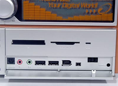 Под нижней, откидываемой вручную крышкой скрываются интерфейсные разъемы для подключения периферии: оптический вход S/PDIF, 2 аудиоразъема (микрофонный вход и выход на наушники), 2 USB (2.0) и 2 FireWire (один стандартный 6-контактный с питанием, второй 4-контактный mini-FireWire). Очень достойные возможности расширения (и это мы еще не рассматривали заднюю панель) чуть-чуть смазаны фактом вывода обоих поддерживаемых чипсетом портов FireWire на переднюю панель, так что если вдруг у вас есть периферийное устройство с этим интерфейсом, требующее постоянного подключения, то нижняя крышка обречена быть всегда откинутой. Из оставшихся элементов управления отметим кнопки включения питания (иначе говоря перехода в режим ПК) и перезагрузки, индикатор активности IDE-устройств и кнопку выдвижения лотка CD/DVD-привода (она находится в группе кнопок верхней части, но исправно функционирует и после «превращения» музыкального центра в компьютер). И не преминем в очередной раз констатировать уверенное «шагание в народ» картоводов по трупам НГМД.