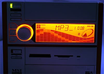 Начнем, пожалуй, именно с «необычной» функциональности, тем более что она доступна сразу после включения в сеть. Внешний вид Mega PC (кстати, акроним «Mega» расшифровывается как MSI Entertainment and Gaming Appliance) полностью соответствует уже привычным «кубикам» от Shuttle, Iwill и прочих; выделяется он лишь блоком со светоиндикаторным экранчиком на передней панели.