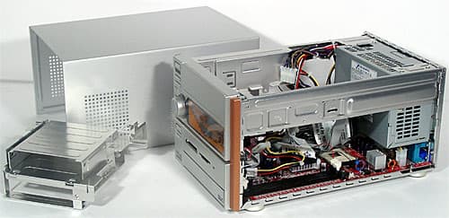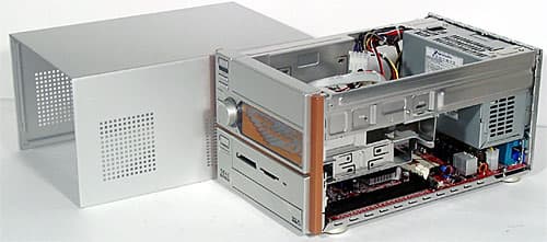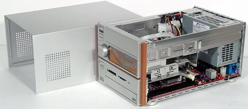 Теперь вернемся все же к основному предназначению barebone-комплекта, тем более что, как уже было сказано выше, два режима работы Mega PC вообще не пересекаются. Внешность этой модели (за исключением, разумеется, верхней части передней панели) уже знакома нам по многочисленным Shuttle XPC и вариациям на ту же тему от других производителей. Алюминиевый корпус размерами 202(Ш)x320(Г)x151(В) мм довольно легок, будучи пустым; из его особенностей можно отметить разве что «лишнюю» группу вентиляционных отверстий на боковой стенке да отделанные по окружности металлом (или пластиком «под металл») низенькие ножки последнее уже явно дань позиционированию комплекта на уровень солидной бытовой техники.