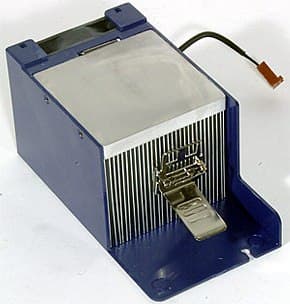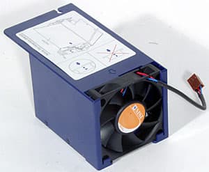 Кулер крепится не на стандартный для Socket 478 держатель (для него маловато места) а на две противостоящие рамки, которые привинчиваются к текстолиту платы (кстати, застегивать кулер очень неудобно, а уж без отвертки про это и думать нечего). Как видите, эта система охлаждения представляет собой алюминиевый радиатор с высокими, почти прямыми ребрами, прикрытый сверху кожухом, который помогает выводить воздух прямо за пределы корпуса (вспомним про два вентиляционных отверстия на боковой стороне корпуса). Действительно, с противоположной стороны в кожух вдвигается 60-миллиметровый вентилятор (Delta Electronics AFB0612VHC, до 5400 об/мин, 28 CFM, 38 дБА), предназначенный для продувки ребер сбоку. Увы, о возникающих при этом проблемах мы уже упоминали, так что трудно однозначно упрекать в низкой тепловой эффективности именно кулер. Итак, на что же способна система охлаждения MSI Mega PC, включающая также и разрезанные на полоски и стянутые по всей длине в узкий пучок IDE-шлейфы?