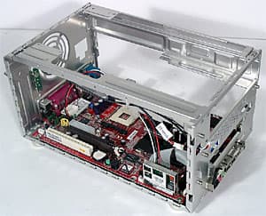 На плате попавшего к нам комплекта, однако, применялась ревизия «B» этого чипсета, так что после включения в BIOS мы спокойно получили «виртуальную двухпроцессорность» и тестировали именно в этом режиме для проверки barebone-комплекта «на прочность». Винчестер, DVD-ROM и видеокарта на базе ATI Radeon 9800 Pro (практически быстрейший ускоритель на момент написания обзора) обеспечивали достойную «тепловую загрузку» Mega PC. Какие же средства охлаждения противостояли напору горячих топовых компонентов? Увы, ими исследуемый компьютер оказался небогат. Мосты чипсета прикрыты радиаторами (а северный еще и вентилятором), транзисторы в цепи питания процессора тоже (традиционно для MSI), 80-миллиметровый вентилятор блока питания, расположенный на задней стенке корпуса, работает на выдув, а для процессора припасен специальный кулер.