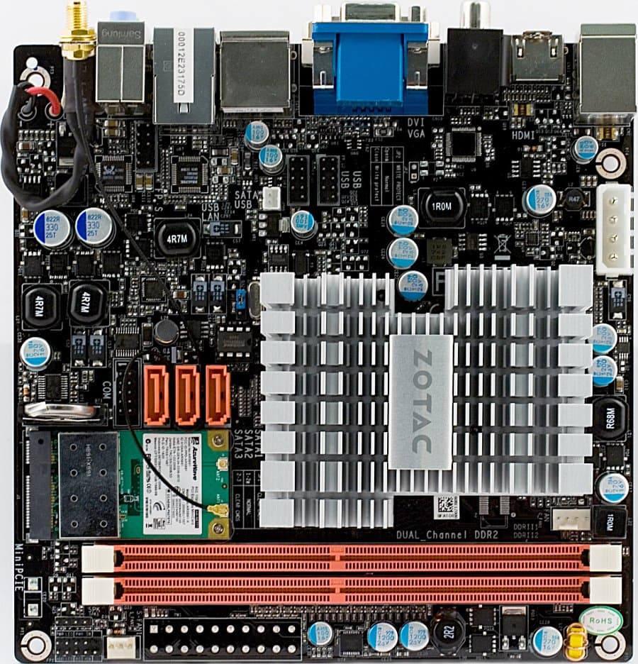 Вряд ли для кого-то станет сюрпризом информация, что Zotac не производит платы в полном смысле этого слова, а лишь заказывает производство референсной платформы NVIDIA с необходимыми параметрами у OEM-производителей. В данном случае компания готова предложить нам миниатюрную материнскую плату форм-фактора mini-ITX с интегрированным процессором линейки Intel Atom. Поставляются два варианта: старший с двухъядерным Atom 330 и предустановленным модулем Wi-Fi-n, а также младший — с одноядерным Atom 230 и без модуля Wi-Fi. Кроме того, возможен либо вариант поставки с внешним блоком питания (и распайкой сопутствующих преобразователей питания на плате), либо «голая» плата, возлагающая проблему питания всех компонентов системы на плечи стандартного БП ATX. Пересечение этих вариантов дает нам 4 комбинации, характеристики которых мы для простоты свели в таблицу: