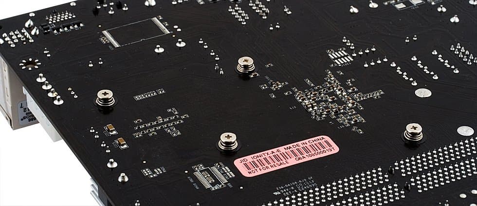 Радиатор крепится к плате нормальными металлическими винтами, а не дохлыми пластиковыми защелками, не обеспечивающими к тому же нормального усилия прижима. Референсные настольные платы NVIDIA уже давно применяют такое решение, не постеснялись использовать его и здесь.