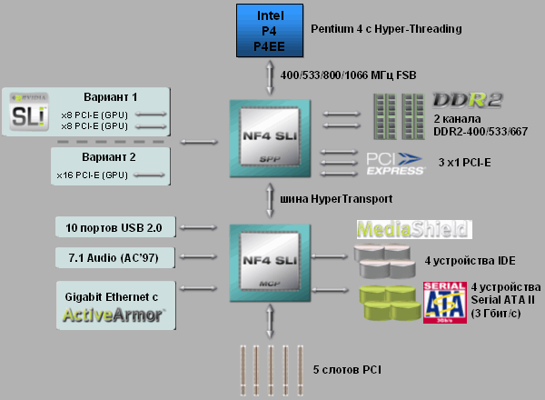 Не нужно даже смотреть на блок-схему чипсета, чтобы представить себе его возможности, так как все функции nForce4 SLI перекочевали в новинку без изменений, за исключением двух неизбежных: смены процессорной шины и интеграции контроллера памяти. Напомним, что у AMD Athlon 64/FX контроллер памяти интегрирован в процессор, поэтому чипсет его лишен, что сильно уменьшает сложность и размер северного моста и даже дает возможность объединить мосты чипсета в один чип, как у nForce3/4. Продукт с именем «Intel Edition» по необходимости обладает двухканальным контроллером памяти (NVIDIA прогнозируемо сделала выбор в пользу DDR2), и компания снова вернулась к практике двух мостов. Итак, nForce4 SLI IE имеет следующую функциональность: