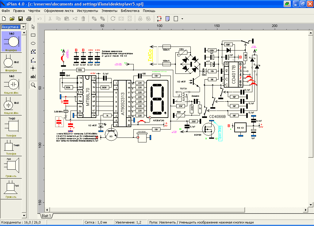 На подготовительном этапе рисовать не слишком громоздкие электрические схемы очень удобно в также русифицированной программе sPlan 4.0 (~450 КБ).