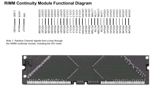 Поскольку канал RAMBus является единой неделимой структурой, то чтобы не рвать последовательное соединение микросхем памяти в канале пустые разъемы не допускаются их необходимо заполнять специальными продолжителями (D-RIMM-CONT Direct Rambus RIMM Continuity Module), представляющими собой печатную плату RIMM, не содержащую активных или пассивных компонентов. Одноканальная структура для функционирования должна содержать как минимум один модуль памяти, а остальные имеющиеся разъемы обязательно заполняются продолжителями. В свою очередь, многоканальная конфигурация строится по аналогичной схеме: каждый канал должен иметь как минимум один модуль памяти и продолжители (по количеству свободных разъемов), причем варианты заполнения одного канала модулями, а другого продолжителями не допускаются. Как и модуль памяти RIMM, продолжитель D-RIMM-C имеет выводы, покрытые золотом.