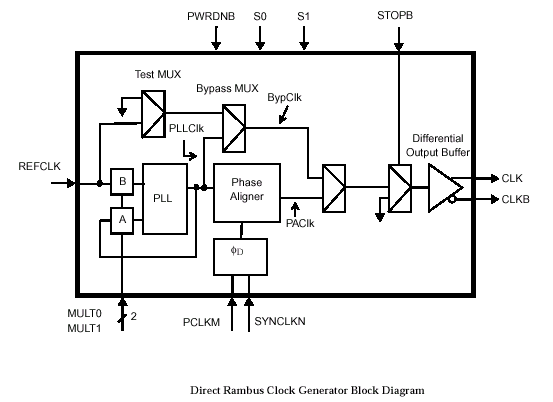 Внутренние блоки DRCG предусматривают наличие транзитного (BypassMux), тест (TestMux) и основного (MainMUX) мультиплексоров, дифференциального выходного буфера (DOB Differential Output Buffer), фазового детектора (fD Phase Detector), блока выравнивания фазы сигнала (Phase Aligner) и двух делителей (A/B) во входной цепи внутрикристального блока фазовой автоподстройки частоты (PLL Phase Locked Loop), который введен с целью создания петли обратной связи для стабилизации частоты на выходе.